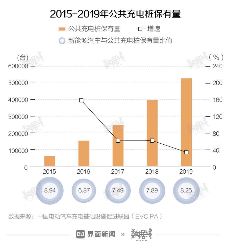 2015-2019年,全国公共充电桩保有量由近5.8万台增加至51.6万台,增幅近8倍,年均增幅达78%;新能源汽车与充电桩保有量比值由2015年的7.84:1改善至2019年的3.50:1,新能源汽车与公共充电桩保有量比值由8.94:1发展至8.25:1。