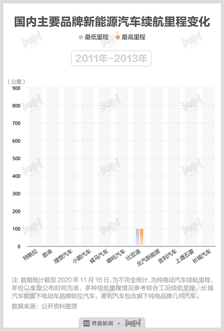 随着技术水平的不断提升,新能源汽车续航里程近年来飞速增长。2011年,比亚迪首款纯电动家用车型e6先行者上市时,其续航里程为300公里,到今年比亚迪纯电动车型中最高续航里程已达605公里,较最初增长超一倍。
