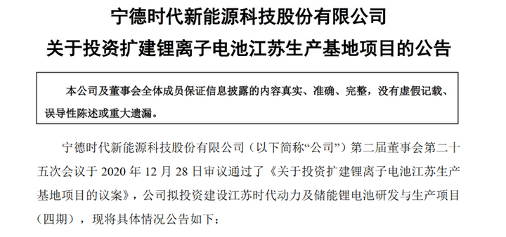 12月29日晚间,国内锂电池龙头企业宁德时代新能源科技股份有限公司(下称“宁德时代”,300750)连发三条公告,宣布将投资扩建江苏时代动力及储能锂电池研发与生产项目(四期)、动力电池宜宾制造基地项目以及锂离子电池福鼎生产基地项目,总投资不超过390亿元,资金来源均为企业自筹。