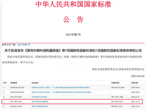 2月23日,工信部官网显示,2月20日工信息部组织制定的《乘用车燃料消耗量限值》强制性国家标准(GB19578-2021)由国家市场监督管理总局、国家标准化管理委员会批准发布,将于2021年7月1日起正式实施。