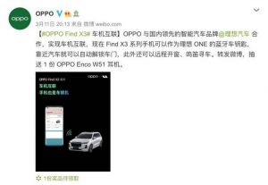 3月11日,OPPO宣布旗下最新发布的高端旗舰Find X3系列手机与理想汽车达成合作,实现车机互联。据官方介绍,Find X3系列手机作为理想ONE(参数|询价)的蓝牙车钥匙,靠近汽车即可自动解锁车门,此外还可以远程开窗、鸣笛寻车。