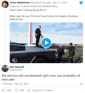 网友James Stephenson问道:“埃隆,Semi的进展如何?你认为哪一年我们会看到无人驾驶列队?”马斯克没有对即将到来的上市做出保证,反而表示:“我们现在受到的电芯限制太大,但明年可能会好起来。”