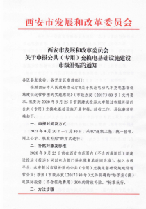 按照西安市人民政府办公厅《关于规范电动汽车充电基础设施建设运营管理的实施意见》(市政办发【2017】80号文)文件要求,西安市发改委对2020年9月25日前新建成投运未申领过市级补贴的公共(专用)充换电基础设施开展申报、验收工作。2021年4月20日-7月30日,采取“逐级上报、统一验收、网上公示、核发补贴”的方式进行。