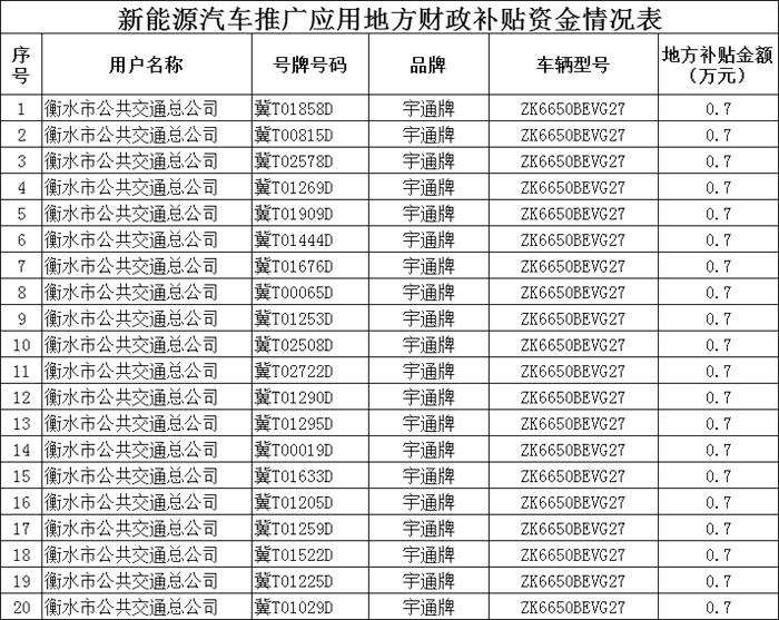 衡水市工业和信息化局1月3日发布《关于拨付新能源汽车推广应用地方补贴的公示》,公示了衡水市公共交通总公司2019年购买的20辆新能源公交车的补贴资金情况,补贴金额共14万元,由于公交行驶里程未达到2万公里,预补贴50%。