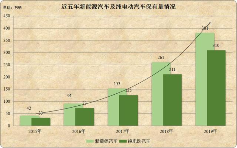 新能源汽车保有量达381万辆。截至2019年底,全国新能源汽车保有量达381万辆,占汽车总量的1.46%,与2018年底相比,增加120万辆,增长46.05%。其中,纯电动汽车保有量310万辆,占新能源汽车总量的81.19%。新能源汽车增量连续两年超过100万辆,呈快速增长趋势。