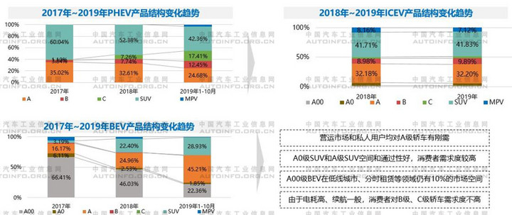 结合细分市场需求趋势,我们判断2019年到2025年,PHEV的产品结构将与ICEV基本趋同。考虑到技术和市场等多重原因,BEV将形成独有的稳定的产品结构。主要表现在以下方面:
