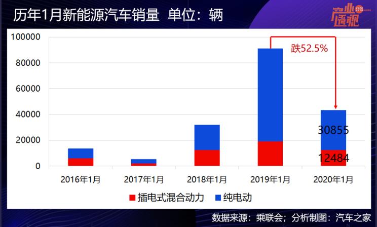 乘联会数据显示,2020年1月国内新能源乘用车批发销售43339辆,同比大降52.5%,其中纯电动车批发30855辆,同比降57.3%,插电式混合动力车批发12484辆,同比降34.4%。1月份新能源乘用车批发销售渗透率也跌到了2.69%。