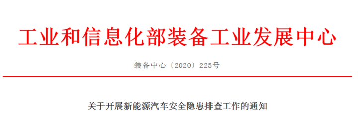 6月8日,工信部装备工业发展中心在网站上发布通知,要求新能源汽车生产企业及动力电池供应商对生产的新能源汽车开展安全隐患排查工作。