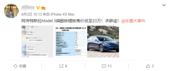 值得注意的,这位网友还称, 国产Model 3磷酸铁锂电池版车型售价23万元起售。作为参考,目前最便宜的国产Model 3售价为29.18万元,相当于便宜了6.18万元。对此有网友表示“等待官方辟谣”“那估计续航得打个折”。 截止到目前,特斯拉官方并未对此事进行回应,不过有汽车媒体直指其为假消息,至于真相恐怕要周五才能最终确认。