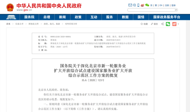9月7日,中国政府网发布信息,国务院原则同意《深化北京市新一轮服务业扩大开放综合试点建设国家服务业扩大开放综合示范区工作方案》。