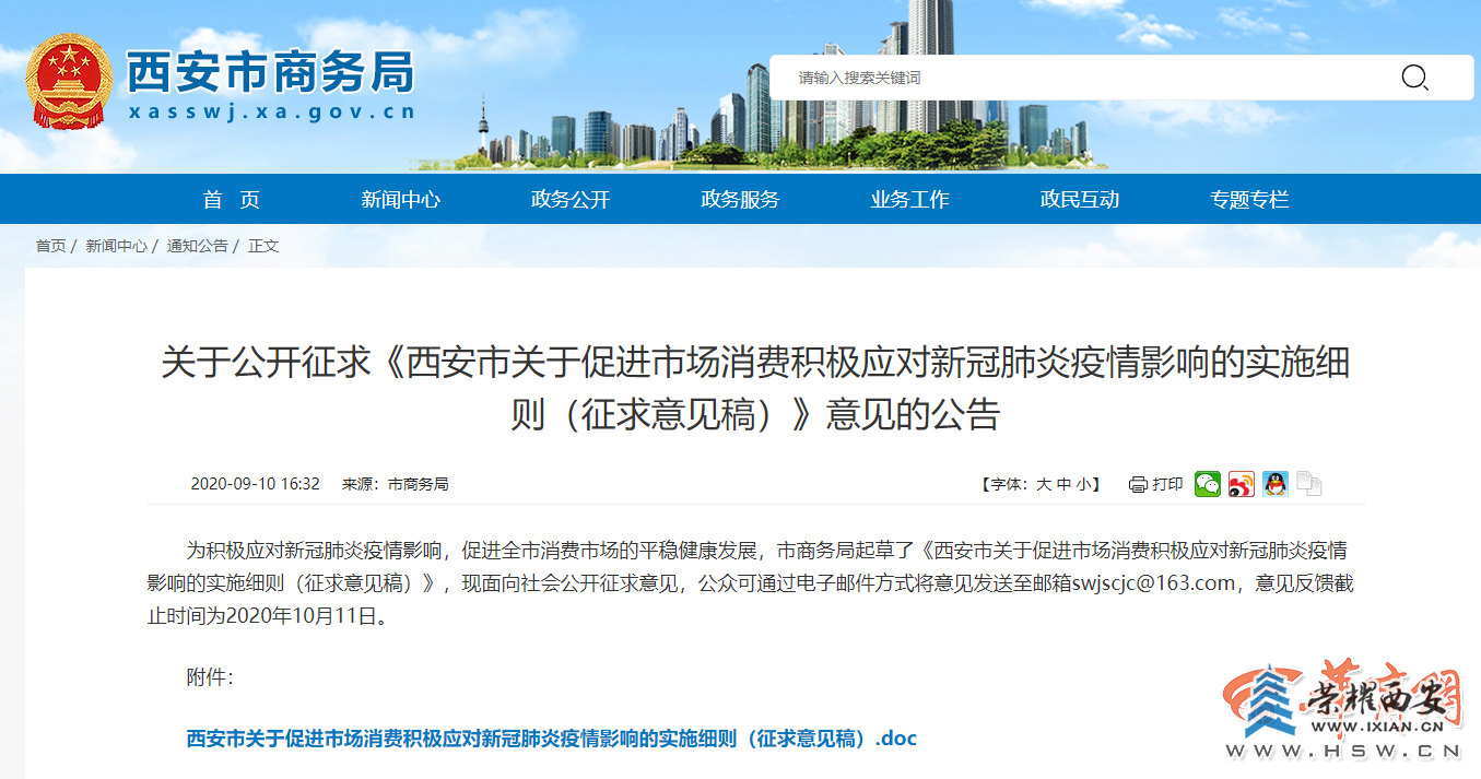 9月14日,一条“重磅!逐步放宽汽车限行规定!西安正在征求意见”的消息引发关注。 记者登录西安市商务局网站查询发现,确有一条关于公开征求《西安市关于促进市场消费积极应对新冠肺炎疫情影响的实施细则(征求意见稿)》意见的公告。